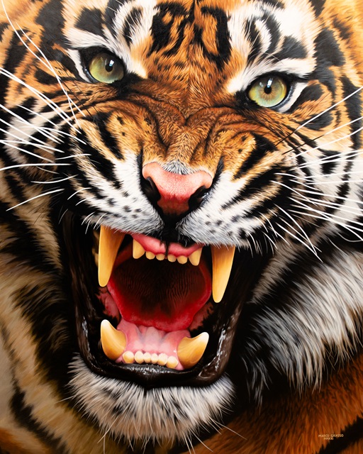 “I suoi dipinti descrivono nei minimi dettagli la “pelle” – per usare il termine in senso ampio ad indicare l’esterno, la superficie dei corpi – di animali selvaggi. Pellicce, piume, squame, carapaci sono indagati con il suo pennello in modo estremamente dettagliato, con una precisione tale da rendere quasi tattile la superficie dipinta.” spiega la curatrice Elena Di Raddo e prosegue “Il naturalismo di Marco Grasso non è però da intendersi nel senso ottocentesco del termine, ma si tratta di una pittura che ha quale obiettivo la descrizione delle caratteristiche di corpi degli animali, fino a raggiungerne anche gli aspetti del loro carattere. Allo stesso tempo l’arte di Marco Grasso ha anche lo scopo di valorizzare la natura animale in tutti i suoi aspetti locali e globali. Per lui, come per tutti gli artisti dell’Artists for Conservation (AFC), descrivere gli animali, isolati dal loro contesto, con una precisione che suscita ammirazione per la complessità, varietà e bellezza della natura in tutte le sue forme, significa anche essere consapevoli del valore della natura e della necessità che venga preservata”.