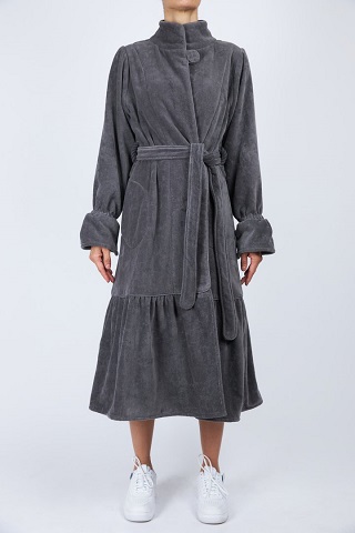 Déshabillé lungo con collo alto, caratterizzato da spalle a sbuffo, polsini a volant e dalle tasche laterali nascoste e con ricercati passanti della cintura a forma di alamari. Chiusura con bottone ricoperto sul collo e con cintura in vita. Disponibile nelle taglie S/M, L/XL