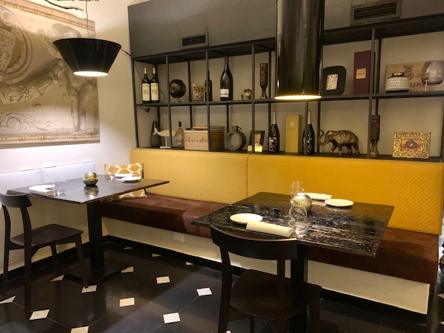 Il nero e l’oro sono i colori principali del locale, raffinatezza e calore che si fondono in un ambiente dall‘atmosfera neoclassica, con soffitto con volte a botte e decorazioni alle pareti che ricordano gli stucchi di un antico palazzo. Completa il décor un elegante pavimento nero e bianco. I tavoli in marmo travertino sono rivestiti in resina nera con striature bianche con una raffinata mise en place nuda, che fa risaltare i piatti dell’executive chef Daniele Rebosio, da novembre 2021 ai fornelli del locale.