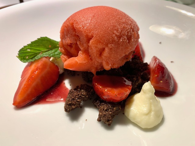 fragole al Barbera, cremoso di cioccolato bianco e crumble di cacao.