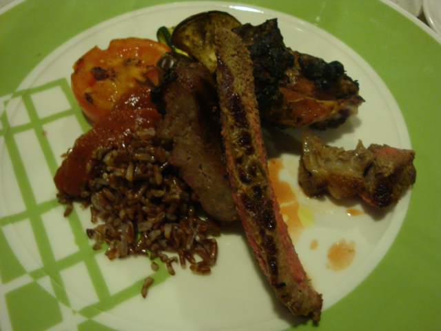 grigliata di carne con riso Ermes, verdure e salsa barbecue