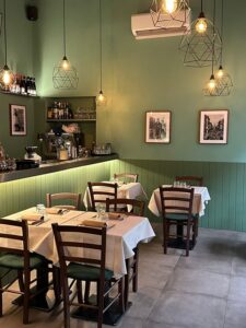 La Sciura accoglie gli ospiti in una sala con trentaquattro coperti, dove il filo conduttore è un piacevole colore verde salvia, che si ritrova nella boiserie, nei divani di velluto, che insieme al legno scuro delle sedute, costruiscono un’eleganza sobria, progettata per essere vissuta con naturalezza. Alle pareti foto in bianco e nero della vecchia Milano. Ne nasce uno spazio intimo ma dinamico, ideale per un pranzo informale o per una cena rilassata. Il locale dispone anche di un accogliente dehors con una trentina di coperti.