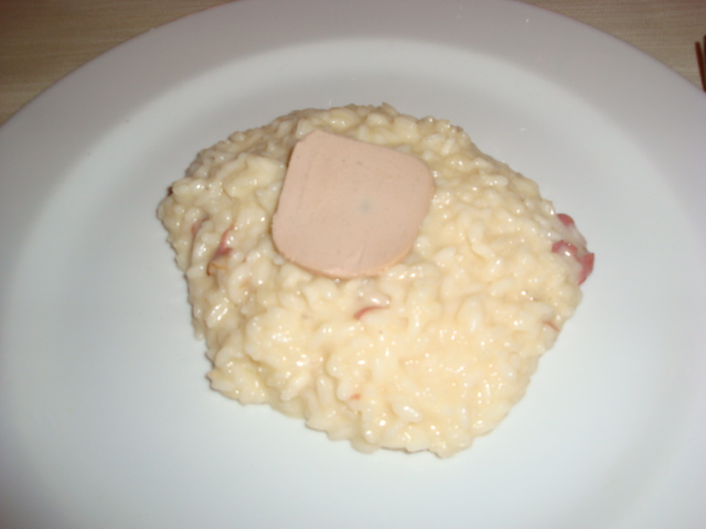 risotto mantecato con petali di speck d'oca al Crémant Blanc de Blancs