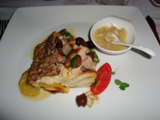 filetto di dentice alla ligure con patate, olive taggiasche e cipolle stufate con pinoli
