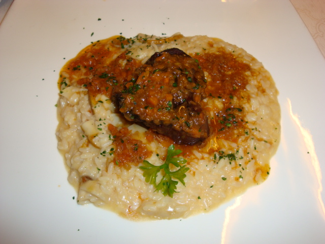 guanciale di vitello in umido agli aromi di montagna su risottino ai funghi porcini nostrani