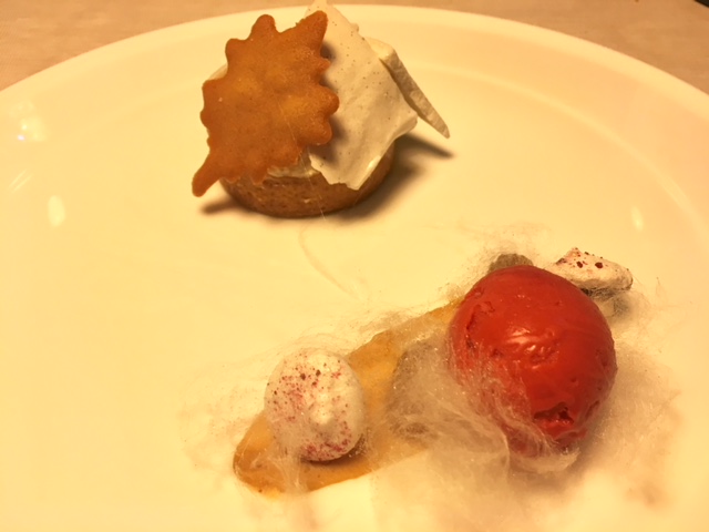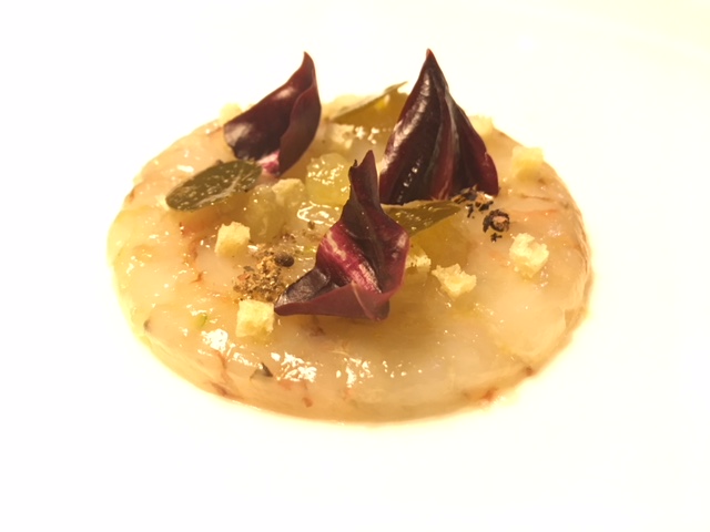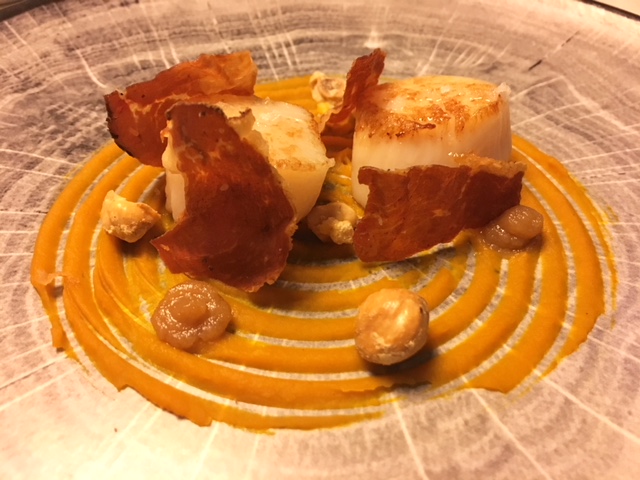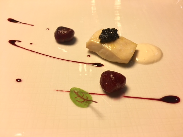 Ecco il menu preparato da Simone Gottardello, che ho assaggiato durante la mia ultima visita in hotel preceduto da due amuse bouche baffa di suino su crosta di pane e speck d’anatra con lamponi e storione e caviale Calvisius con rape rosse; come antipasto crudo di mazzancolle dell’Adriatico con limone, capperi e radicchio di Treviso; noci di capesante arrostite, purea di zucca, nocciole e speck; spaghettoni Matt Monograno Felicetti mantecati al ristretto di gamberi di fiume e caviale Calvisius, piatto da 10 e lode!; a seguire rombo, broccolo fiolaro di Creazzo, aglio nero e zuppetta di garusoli in porchetta. Infine il dessert: Tra una Linzer e un Mont Blanc. Il tutto accompagnato da Fior di Rosa, Bardolino Chiaretto Spumante dell’azienda Guerrieri Rizzardi.