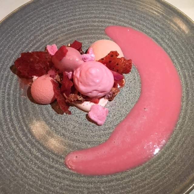 Veal, red Kampot pepper glaze, rudish, raspberry oil