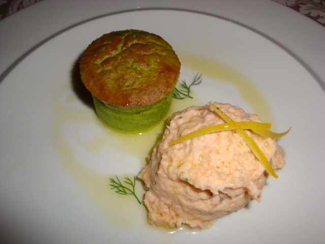 gateau di piselli con trota mantecata alle erbe fini e julienne al limone