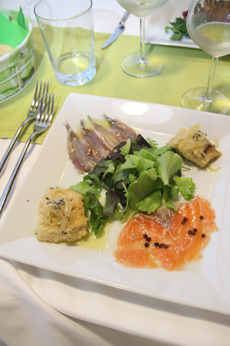 salmone marinato agli agrumi e pepe rosa, salmerino in carpione profumato alla lavanda e alici marinate