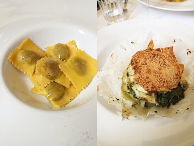 ravioli ripieni d’anatra al burro e salvia e lasagnetta di radicchio, coste e formaggio grana
