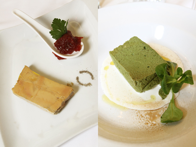 terrina di paté di fegato d'oca con cotognata, sformatino di ricotta e spinaci e fonduta di salva cremasco