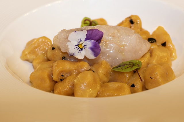 gnocchetti di patata dolce mantecati al burro e cannella con tartare di scampi
