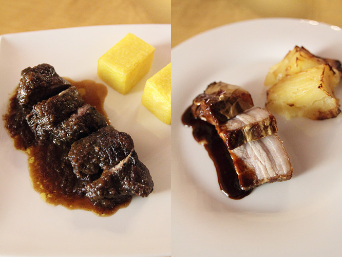 guancia di vitello brasata e pancia di maialino da latte, pelle croccante e salsa alla senape