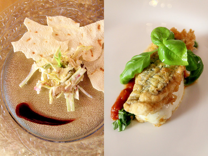 insalata di carciofi con pecorino, pane carasau e salsa di vino rosso e parmigiana di pesce bandiera